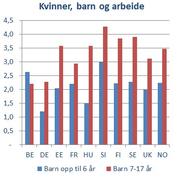 Kvinners yrkesdeltakelse øker når barna begynner på skolen, for alle bortsett fra belgiske kvinner. Uten at jeg har noen ide om hvorfor det er slik. Slovenske kvinner arbeider mest, både når barna er opp til 6 år og når de er eldre.