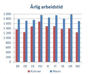 Kvinner i arbeide har kortere arbeidstid enn menn – de jobber altså deltid. Norske og tyske kvinner jobber kortest, hhv. 1.235 og 1.245 timer, og ungarske kvinner jobber lengst med 1.684 timer.