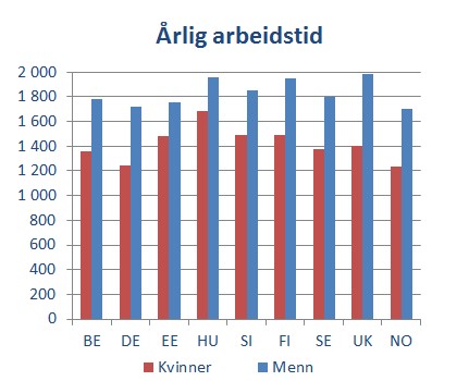 Årlig arbeidstid for de som er i arbeide viser et annet bilde. Ungarske, finske og britiske menn jobber mest, 1.950 timer i året. Norske og tyske menn jobber minst, med i overkant av 1.700 timer i året. Der det ikke er sammenheng mellom gjennomsnittlig antall timer og arbeidstid, som i Belgia og Tyskland, må det skyldes at flere er utenfor arbeidslivet.