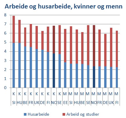 Her dukker forskjellene opp. Ikke i det at kvinner gjør mer husarbeide, og menn arbeider mer utenfor hjemmet, det gjelder alle landene. Men i sum jobber østeuropeiske kvinner mest, og i norske menn gjør mest husarbeide av mennene. Minst i sum gjør tyske og belgiske menn.