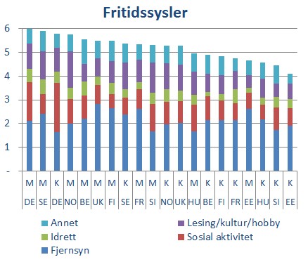 Det er noen interessante forskjeller på hva europeere bruker fritiden sin til. Ungarere for eksempel, bruker over halvparten av fritiden sin til å 2,6-2,8 timer på tv. Norske kvinner ser minst på tv, med 1,6 timer. Den norske mannen titter på tv en halv time mer. Estiske og britiske menn ser også 2,6 timer tv i døgnet.