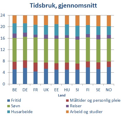 Ganske likt, i alle land bruker man omtrent 16 av døgnets timer på søvn, måltider og personlig pleie, samt fritid. De resterende 8 timene fordeles på arbeid og studier, husarbeide og reise. Det er først når man graver litt i tallene at det kommer noen interessante ting om nordmannen sammenlignet med de andre.