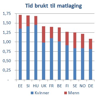 … duger helten ikke. Mat må til. Og det er stort sett kvinner som lager den. Og østeuropeiske kvinner lager aller mest mat. Tyske, norske og svenske kvinner lager omtrent like mye mat. Grunnen til at det brukes mer tid til matlaging i sum i Norge og Sverige er at menn lager mer mat der enn i Tyskland.