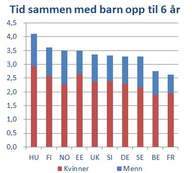 I gjennomsnitt bruker kvinner 2,3 timer sammen med barn under 6 år, og menn bruker 1 time. Fritidsaktiviteter og andre aktiviteter som er simultane og dekket andre steder i undersøkelsen, er ekskludert. Det er altså ikke slik at småtassene er alene 10 timer i døgnet. Tallene gjelder kun par som bor sammen.