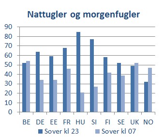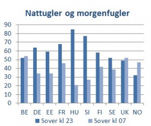 Nordmennene er nattuglene. 32% av nordmennene sover når klokken er 11 om kvelden. Da sover hele 85% av ungarerne. Klokken 7 om morgenen sover bare 21% av ungarerne, mens 47% av nordmennene fortsatt ikke har våknet til liv.